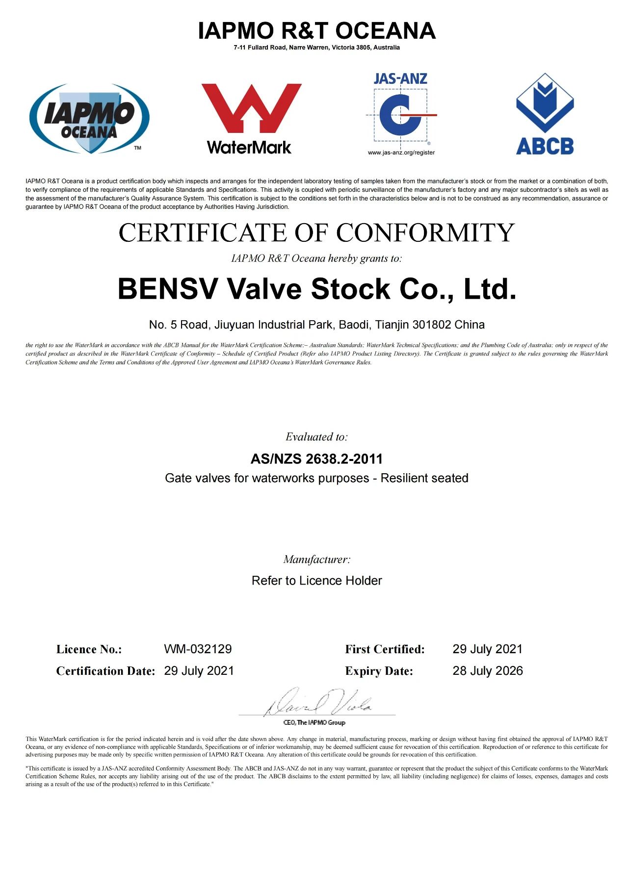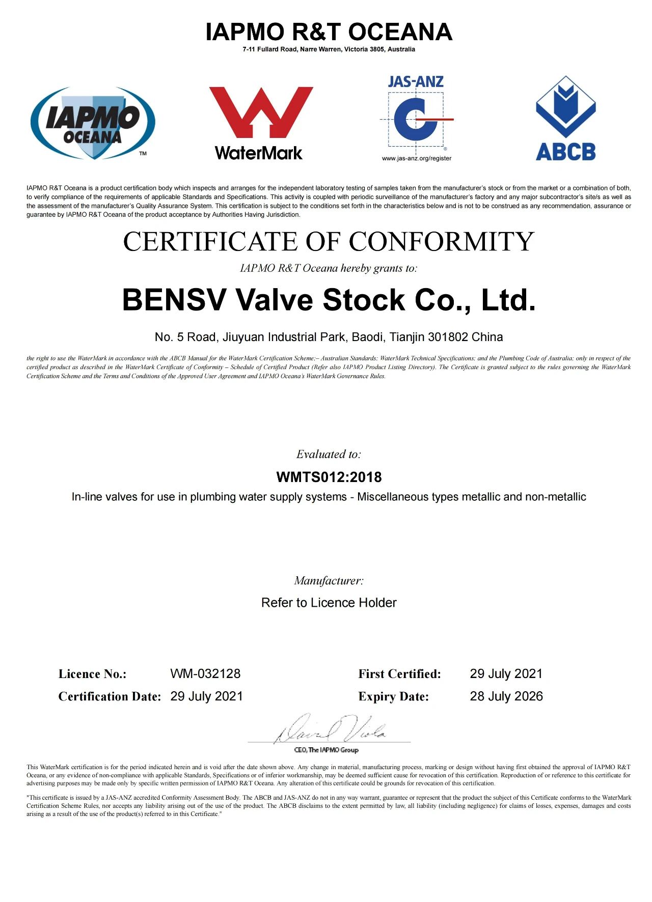WaterMark認(rèn)證是澳大利亞ABCB管理的針對(duì)管道和排水類(lèi)產(chǎn)品的權(quán)威認(rèn)證。2021年初博納斯威向WaterMark授權(quán)認(rèn)證機(jī)構(gòu)提交了認(rèn)證申請(qǐng),通過(guò)產(chǎn)品檢測(cè)、安全評(píng)估和工廠審核等高標(biāo)準(zhǔn),高強(qiáng)度的評(píng)審過(guò)程,于2021年7月29日通過(guò)WaterMark認(rèn)證評(píng)審,獲得證書(shū)。