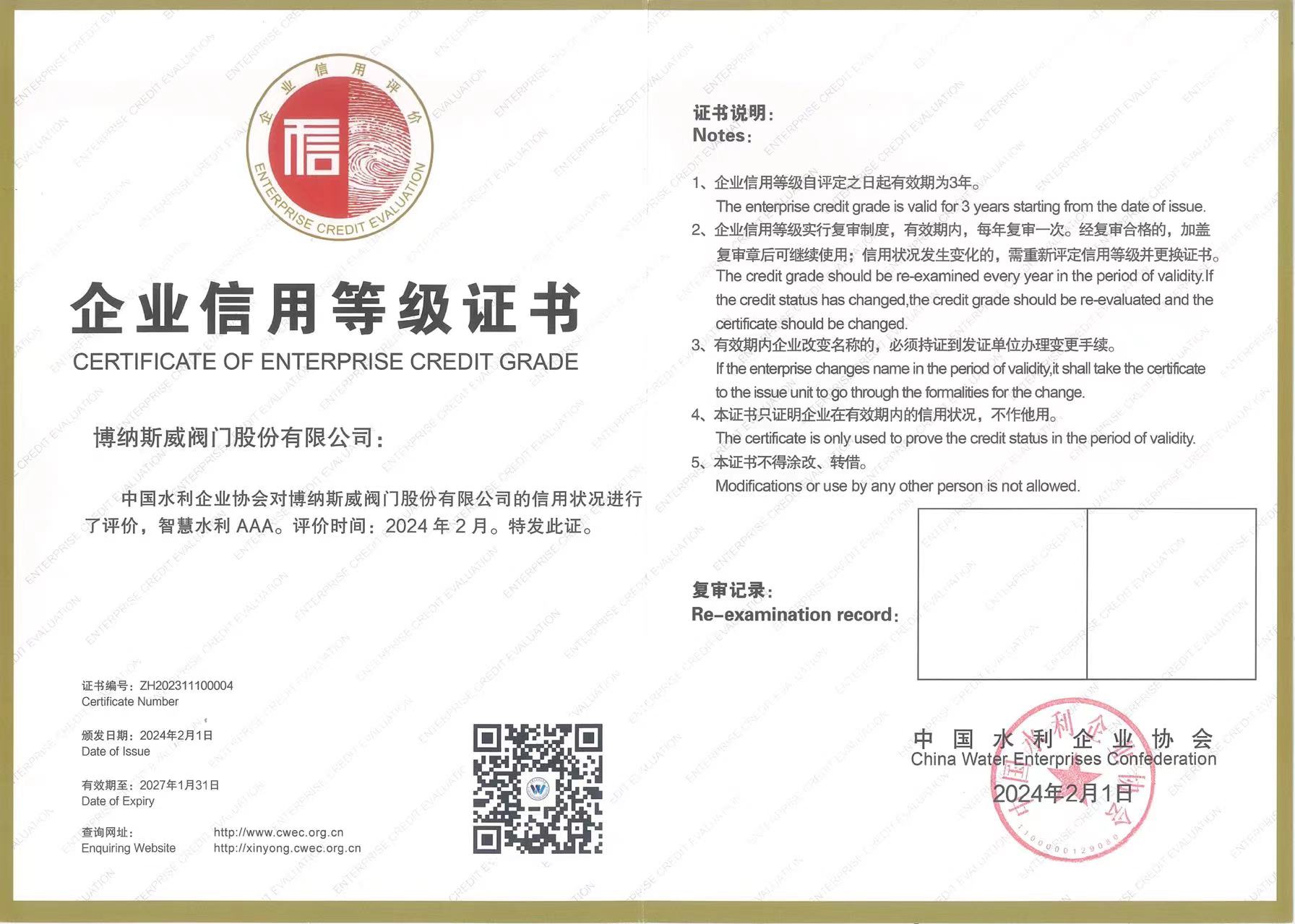 2024年2月1日,中國水利企業協會公布了2023年度智慧水利企業信用評價結果,博納斯威閥門股份有限公司憑借過硬的綜合實力、良好的品牌形象和社會信用,成功獲得“智慧水利企業AAA級”(最高級)信用評價。這是繼2022年被評價為“節水與水處理AAA”信用企業、2023年被評價為“機械制造AAA”信用企業后的又一有力肯定。