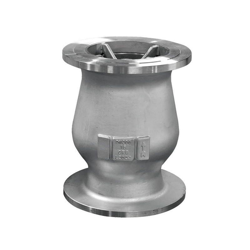 該閥的結構特征如圖所示。該閥的主要特點是在閥門出口端安裝了一個導流體。當介質從進口進入后,托起閥瓣流向出口。當介質停止進入時,出口管道內的介質必然急速回流。由于導流體的作用,回流的介質順著導流體的外表面和閥體的內表面滑向進口,使倒流的介質不直接作用在閥瓣的大端面上,從而避免倒流介質對閥瓣的沖擊,避免了水錘的產生,從而達到靜音的效果。